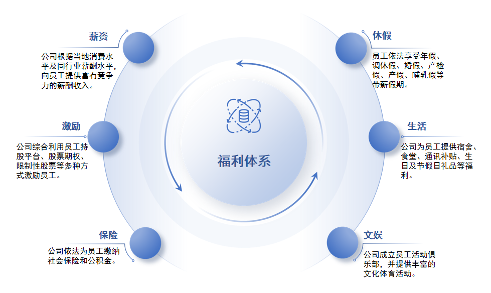 我們為員工提供相對具有競爭力的薪酬福利待遇,致力于創建健康安全的工作環境,采取績效獎金制度、股權激勵制度,使奮斗者得到充分的回報。我們深信,員工晉升及福利待遇與公司經營狀況及其個人績效貢獻密切相關。